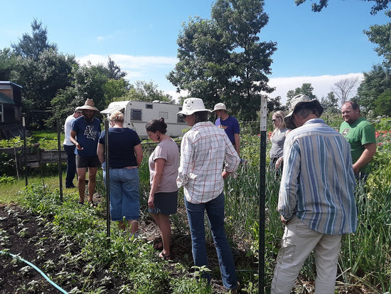 We put an emphasis on sharing what we learn and know. We give tours regularly to all manner of groups. Here is the Sustainable Farming Association in MN getting the details on Garlic growing.