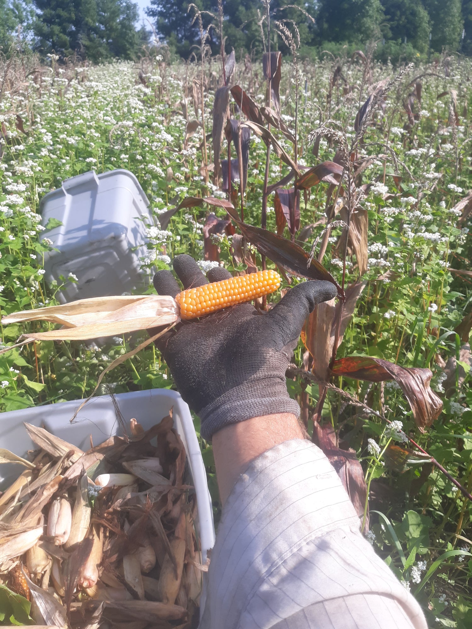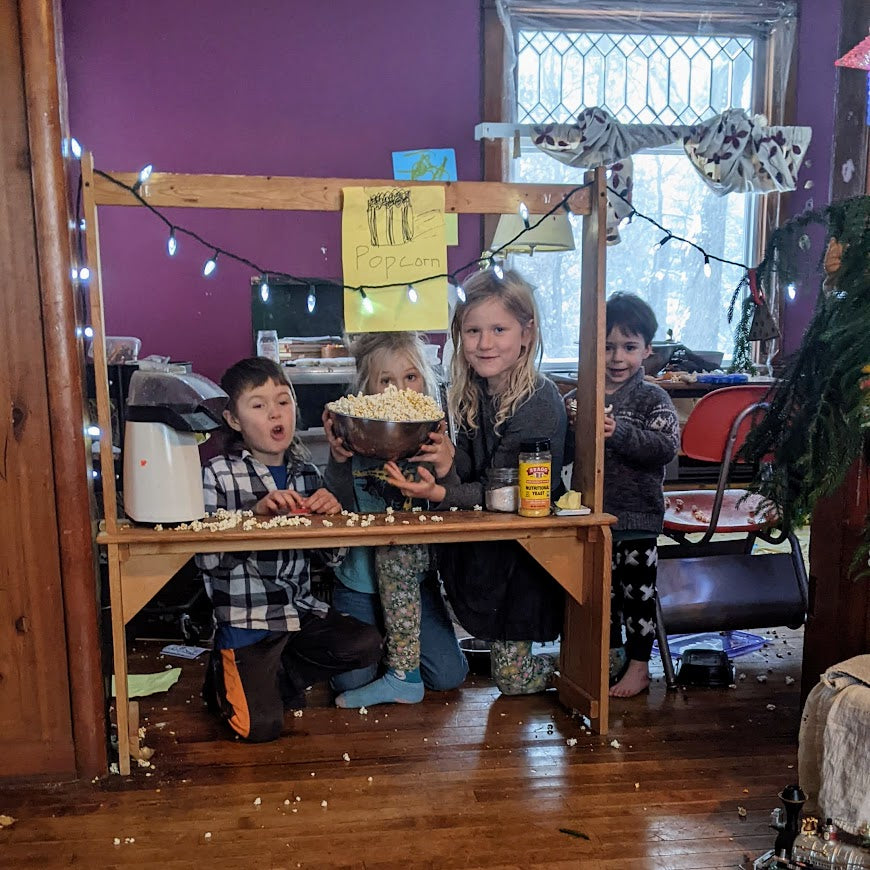 Our homeschool crew really enjoyed working with the popcorn. They stomped and worked the seed off the cobs, sifted it and opened their own popcorn stand!